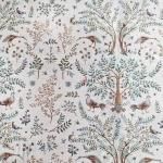 中世絵画のような森を描いたスペイン輸入生地。花咲く木々と鳥たちが優雅。オックス生地でバッグや小物作りに最適。マルチカラー、コットン100%、140c×48c。2,090円(税190円) -