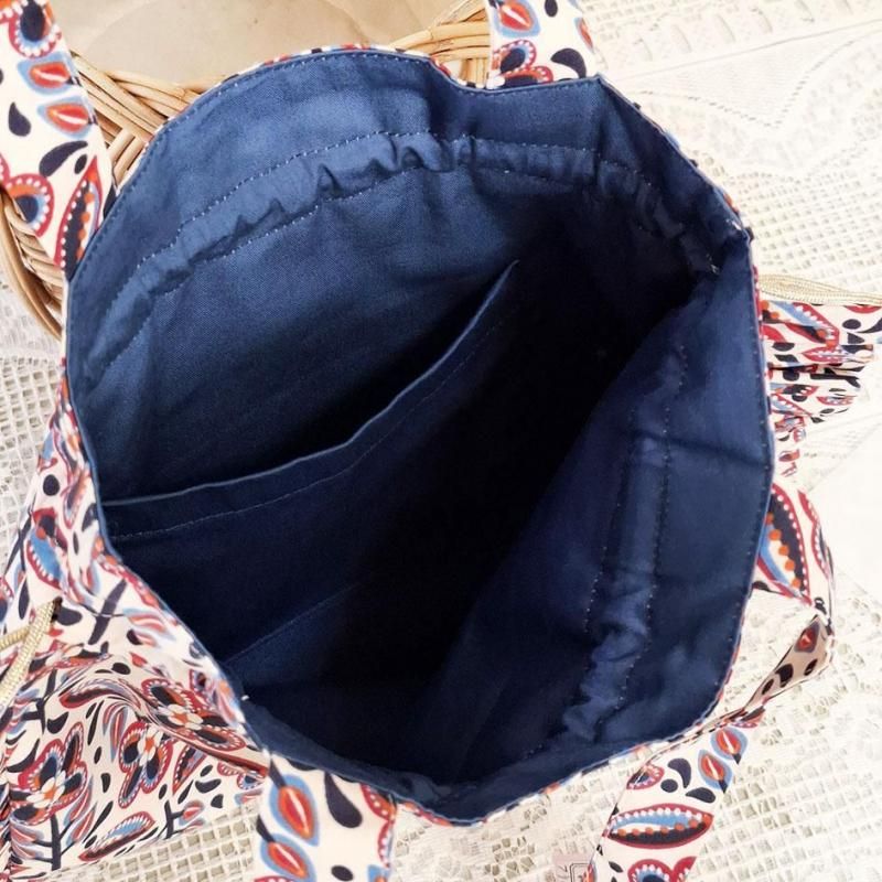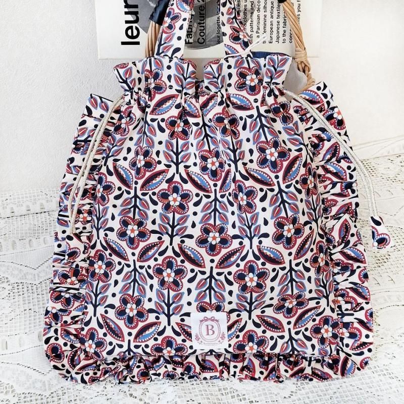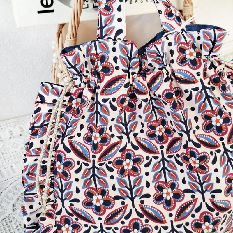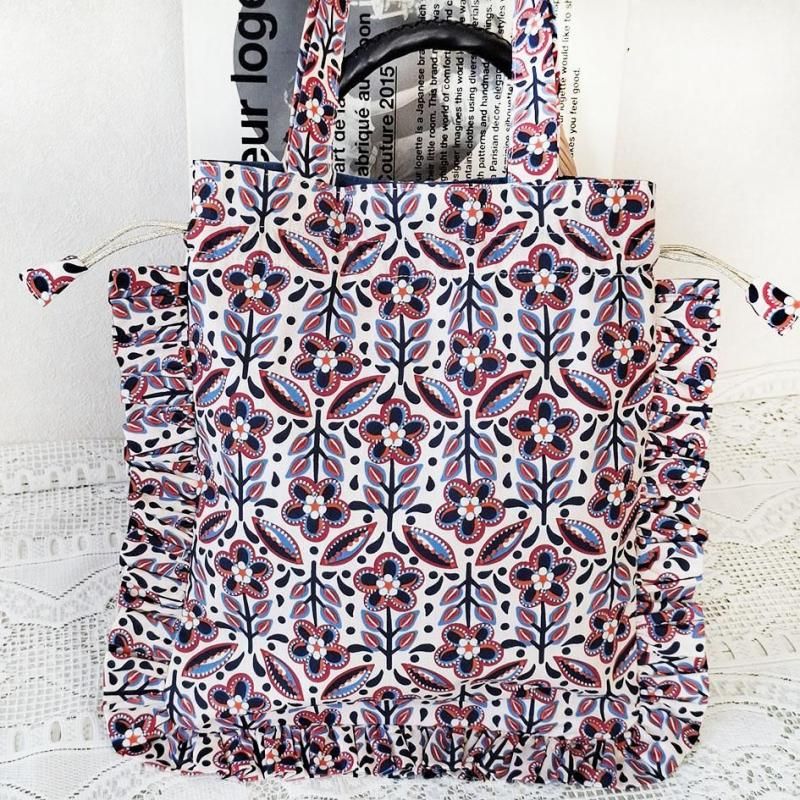 グラフィックタッチで描かれた北欧調の優しい花柄プリントでフリルトートバッグをお作りしました